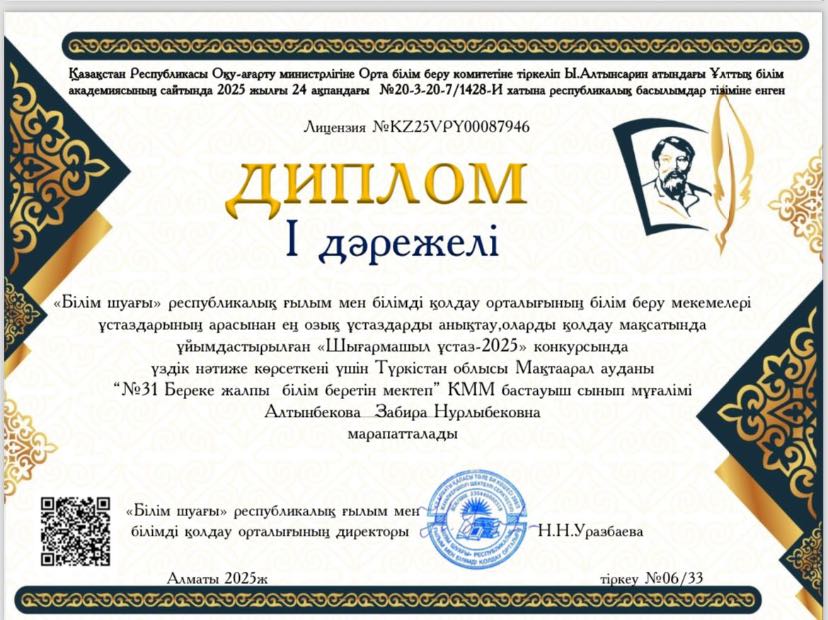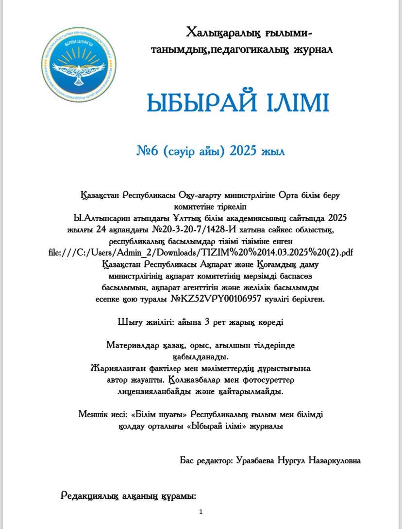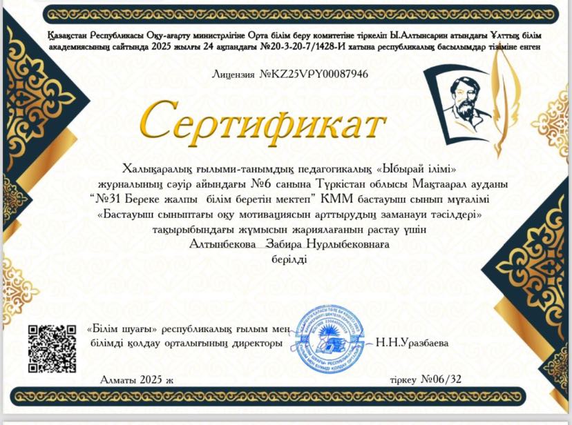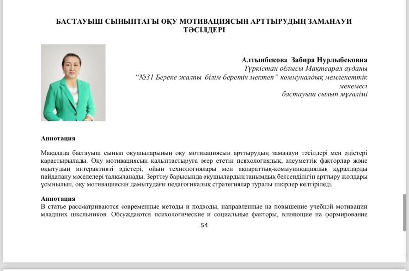 Білім беру саласындағы жаңашыл тәжірибелерді насихаттау мақсатында, «Бастауыш сыныптарда оқу мотивациясын арттырудың заманауи тәсілдері» тақырыбында бастауыш сынып мұғалімі Алтынбекова Забира, халықаралық ғылыми-танымдық “Ыбырай ілімі” журналына мақала жариялады.