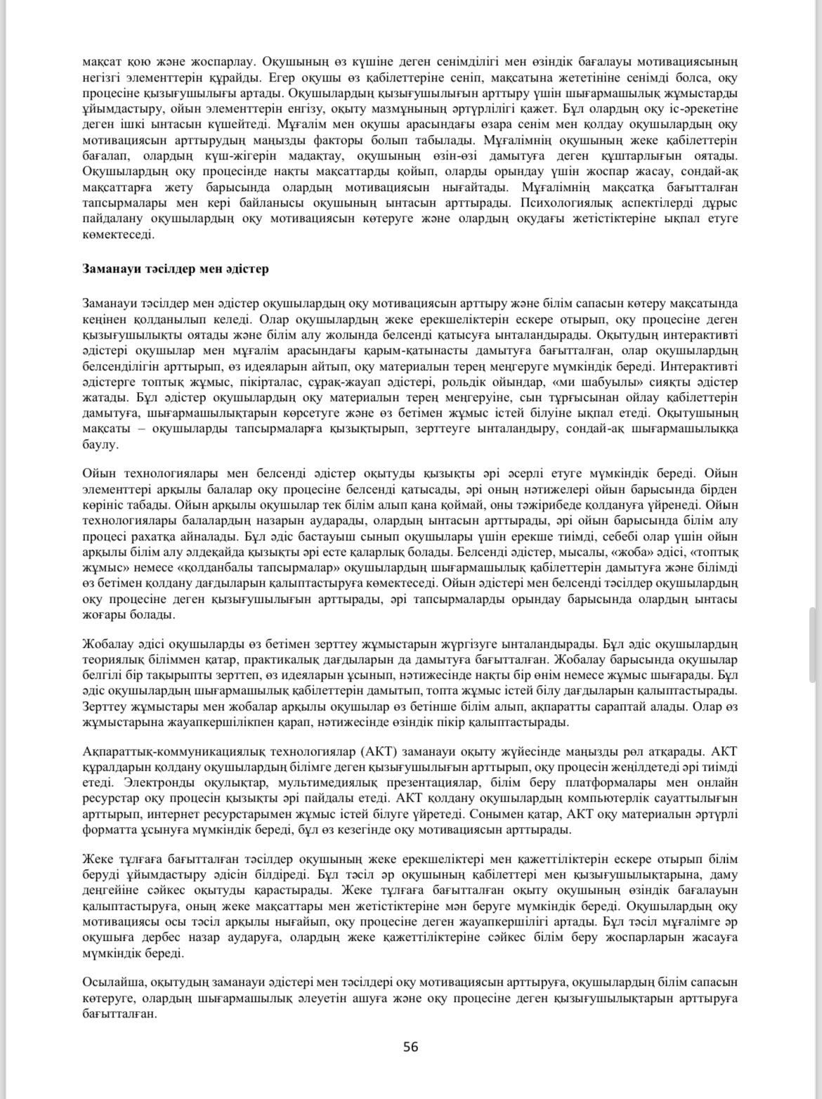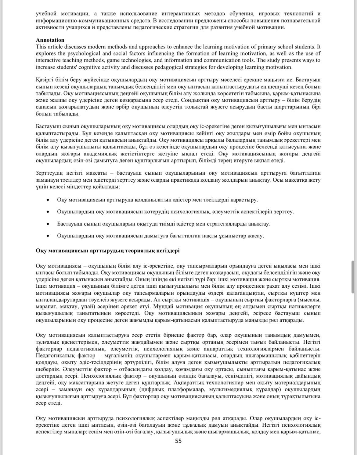 Мақалада бастауыш сынып оқушыларының білім алуға деген қызығушылығын арттыру жолдары, интерактивті әдістер, ойын арқылы оқыту, цифрлық ресурстарды тиімді пайдалану сынды маңызды тәсілдер талқыланған. Сонымен қатар, мотивацияны қалыптастырудағы мұғалімнің рөлі мен оқушының ішкі белсенділігін оятудың тиімді жолдары ұсынылған.