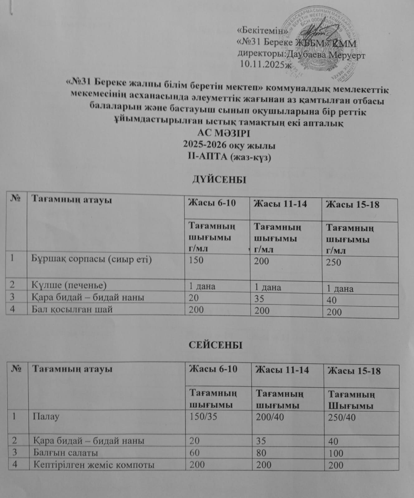 Ас мәзірі » "№31 Береке" ЖББМ КММ