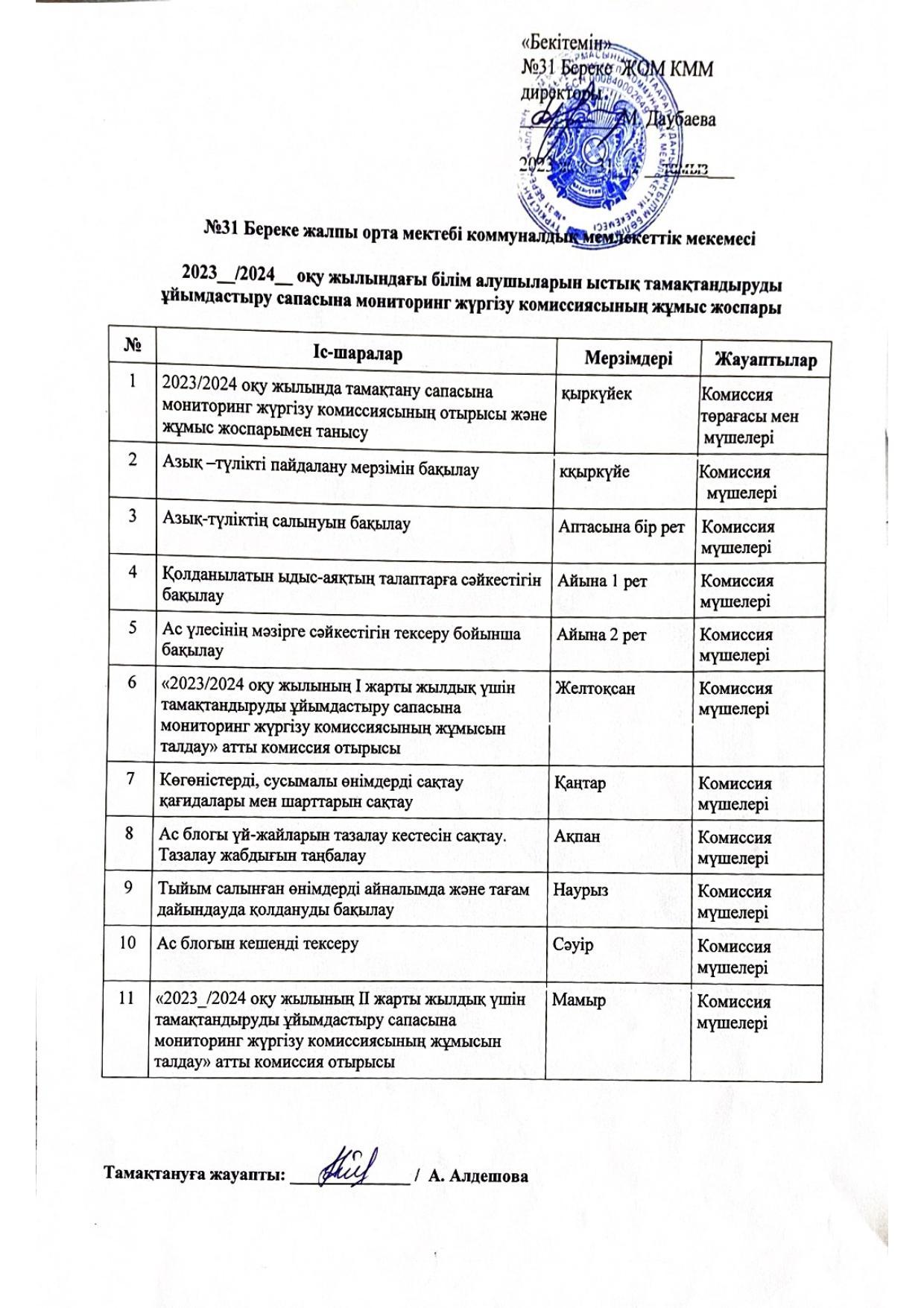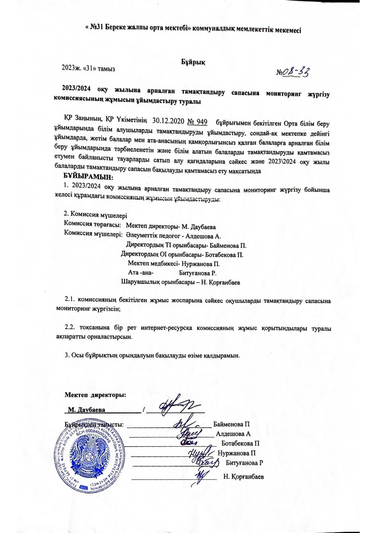 Тамақтандыру сапасына мониторинг » "№31 Береке" ЖББМ КММ