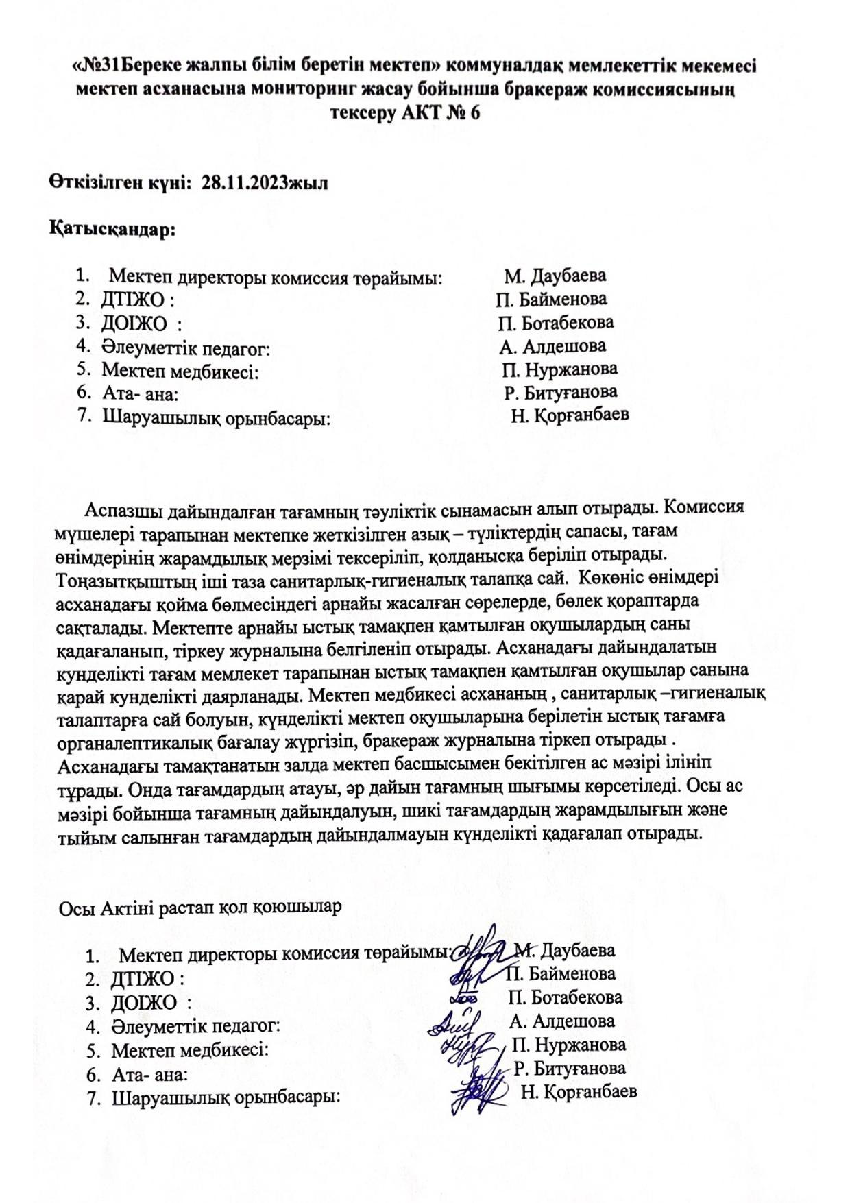 Мектеп асханасын бракираж комиссиясының тексеру. » "№31 Береке" ЖББМ КММ