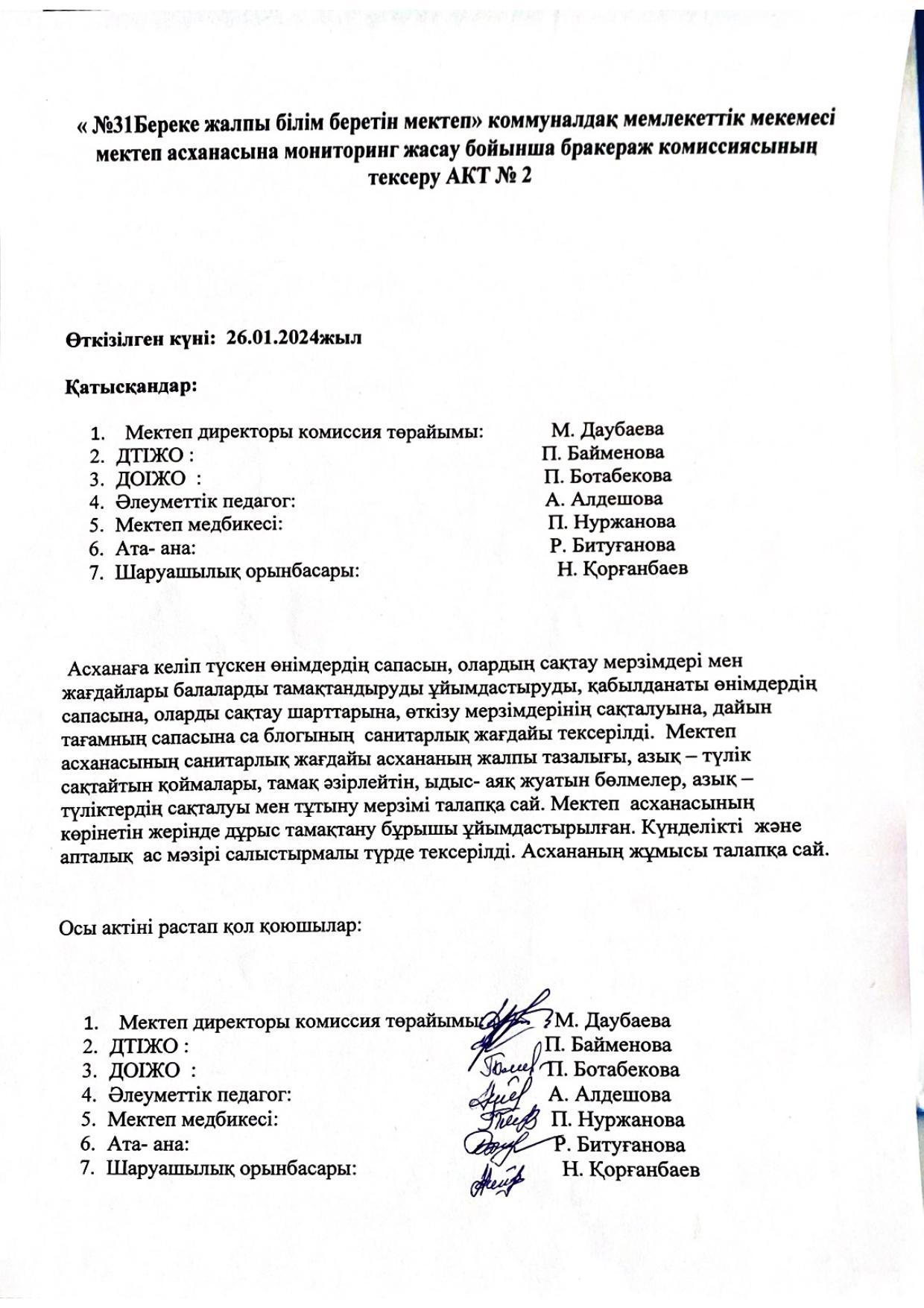 Мектеп асханасын бракираж комиссиясының тексеру. » "№31 Береке" ЖББМ КММ